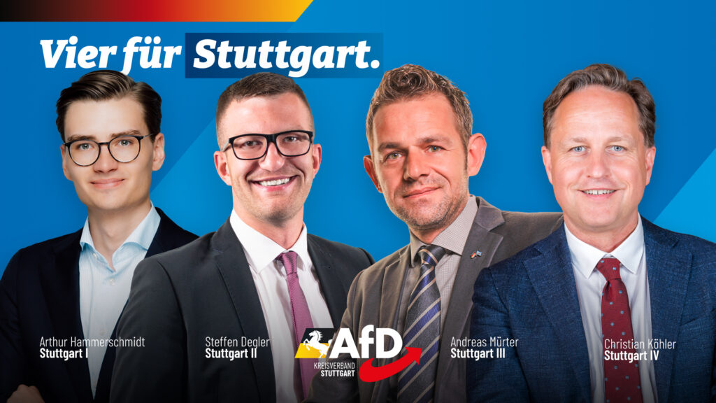 Im Wahlkreis Stuttgart 4 tritt der Politologe und ehemalige Fraktionsvorsitzende der AfD im Stuttgarter Gemeinderat Christian Köhler an. „Es ist Zeit für ein Ende der linksgrünen Deutungshoheit der Altparteien, welche unser Land, unsere Kultur und unser Volk seit Jahren mit ihrem ideologischen Irrsinn der Zerstörung preisgegeben haben“, äußerte sich Köhler mit Blick auf den Wahlkampf. „Die AfD Stuttgart wählte ihre Direktkandidaten in großer Einheit jeweils mit überwältigender Mehrheit. Dies zeigt, dass die AfD sich professionalisiert hat und bereit ist, unser Land zu regieren.